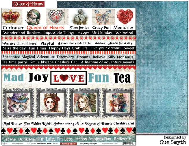 Double sided 12" x 12" scrapbooking paper exclusively designed by Sue Smyth as part of the Queen Of Hearts range.