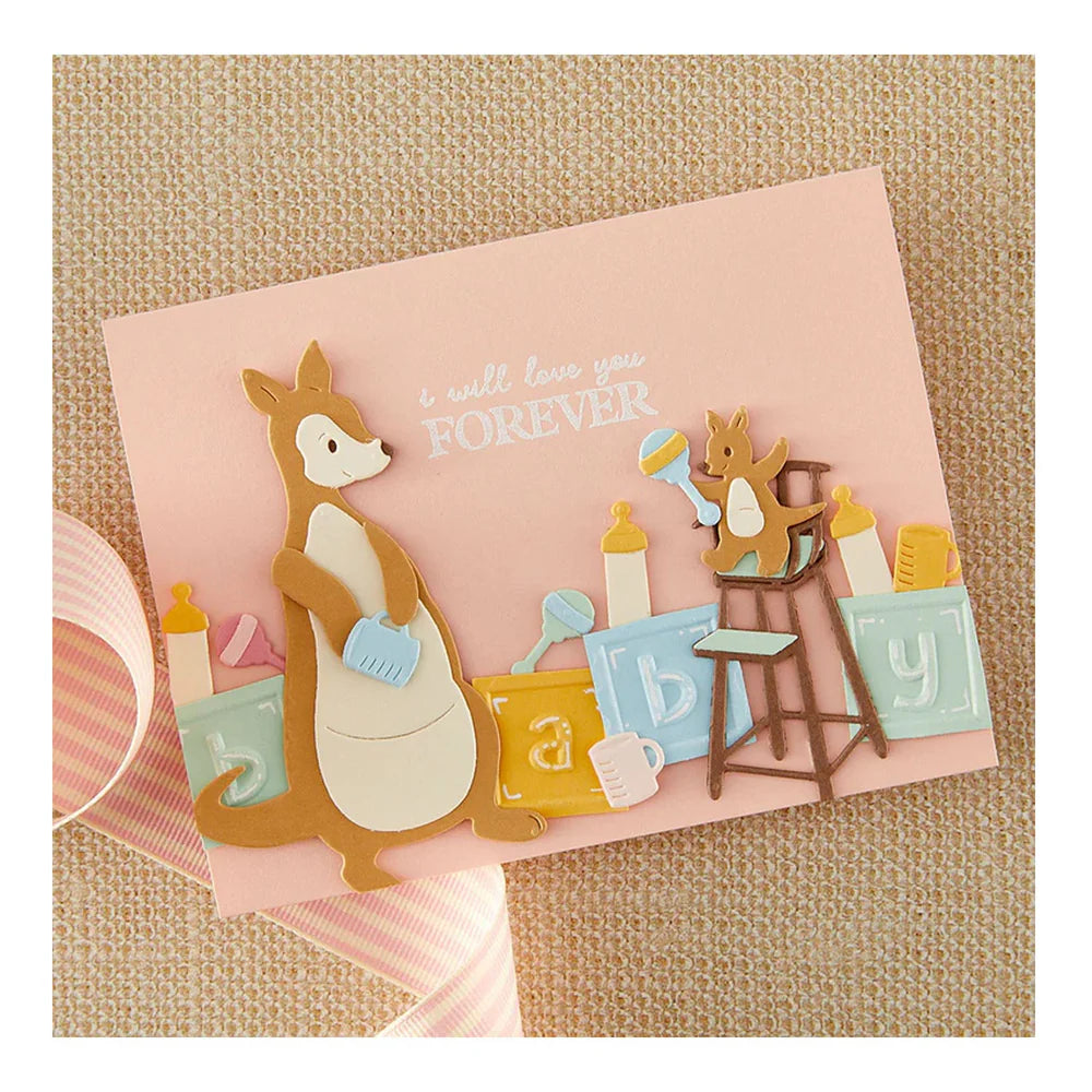Create sweet, storybook papercraft projects with the Kanga & Roo Characters Etched Dies from Spellbinders in collaboration with Simple Stories. Part of the Say Cheese Classic Pooh Baby Collection, this 7-piece thin metal die set assembles Kanga and little Roo with charming baby-themed details.