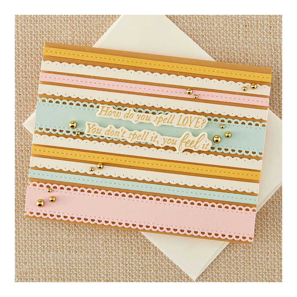 Add charming decorative borders to your papercraft projects with the Ribbon & Trim Etched Dies from Spellbinders in collaboration with Simple Stories. Part of the Say Cheese Classic Pooh Baby Collection, this 5-piece thin metal die set cuts a variety of sweet edged trims ideal for baby-themed designs.