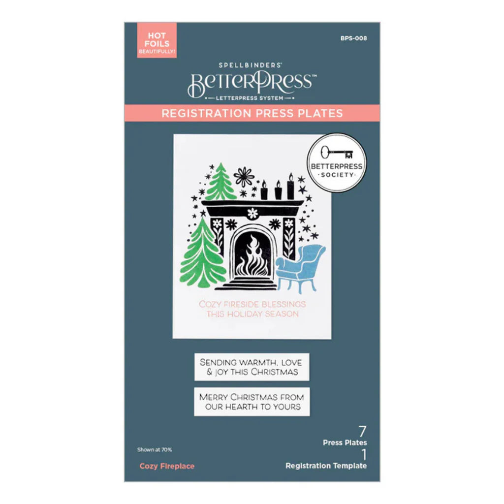 Cozy Fireplace Press Plates is the October 2024 plate for the independent retailers exclusive BetterPress Society. This registration press plate set creates an idyllic winter scene with a roaring fireplace, a cozy chair and cheerful holiday decorations. The set includes three plates to make the central image: the fireplace, two trees and the chair, as well as the acetate registration template for perfect alignment. Also included are three heartwarming sentiments, 'Cozy Fireside Blessings This Holiday Season,' 'Merry Christmas from Our Hearth To Yours,' and 'Sending Warmth, Love & Joy This Christmas.'