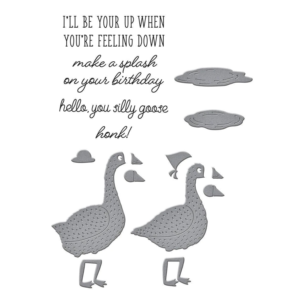 Spellbinders Honk Honk Clear Stamp & Die Set is part of the On the Farm Collection. This delightful set includes eight thin metal cutting dies that create two charming geese, one wearing a hat and the other a kerchief, along with two puddle designs to complete the scene. To add a playful touch, the set features four punny clear stamp sentiments that perfectly complement the die-cut images. The sentiments read: "I’ll Be Your Up When You’re Feeling Down," "Make a Splash on Your Birthday," "Honk!" and "Hello, You Silly Goose." Assembled Geese in Puddles measures approximately 2.59 x 2.31 inches / 6.60 x 5.90 cm. A day on the homestead is especially fun with the On the Farm Collection. Full of punny sentiments and adorable animals, it’s sure to harvest a lot of laughs! Be sure to collect them all and fill your farm with friends.