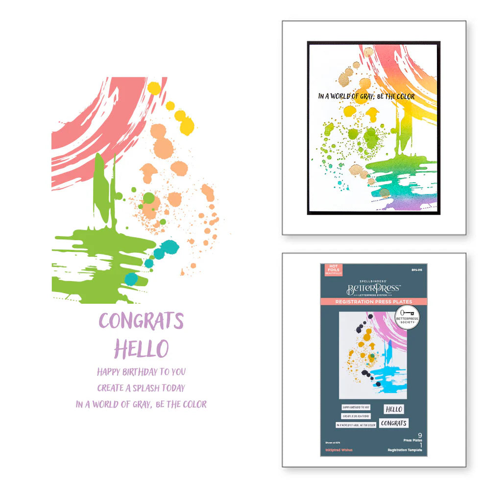 InkSpired Wishes Press Plates is the April 2025 release for the independent retailers' exclusive BetterPress Society. This registration set includes nine press plates of inky splatters and swishes for endless possibilities! Press them all together using the registration template for a full cardfront of colorful marks, or customize your creation by using each of the pieces on their own. Also included are two large sentiments, 'Hello' and 'Congrats' plus three strip sentiments, 'Happy Birthday to You,' 'Create a Splash Today' and 'In A World Of Gray, Be the Color.'
