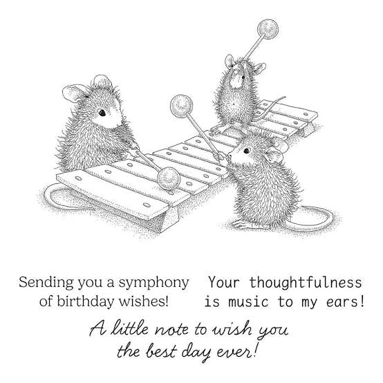The Music to My Ears Cling Rubber Stamp Set, from the House-Mouse Rare Bloom Collection, features the beloved mice Amanda, Monica, and Mudpie making joyful music on a xylophone—whether anyone else enjoys it or not! This set includes four cling rubber stamps: one detailed focal image and three coordinating sentiments—“A little note to wish you the best day ever,” “Sending you a symphony of birthday wishes,” and “Your thoughtfulness is music to my ears.” The heartwarming House-Mouse series is created and copyrighted by artist Ellen Jareckie. Perfect for music lovers and fans of these charming mice.