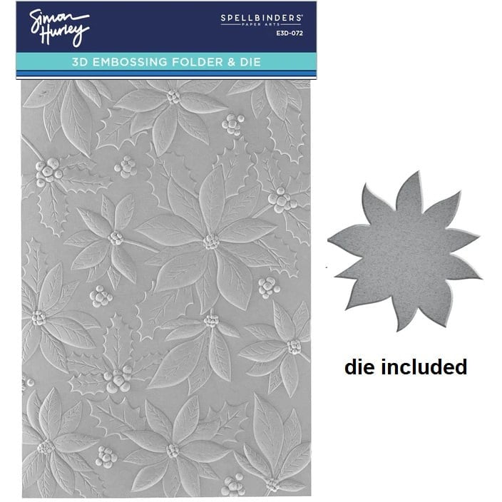 Playful Poinsettia 3D Embossing Folder and Die Set is from the Simon's Snow Globes Collection by Simon Hurley and is a 5.50 x 8.50-inch embossing folder. The folder is filled with a lovely combination of different sizes and style of Poinsettia blooms. It also includes one thin metal cutting die shaped into a Poinsettia flower. Die-cut the flower shape first and then match up the shape with the embossed shape in the 3D Embossing Folder for better results.