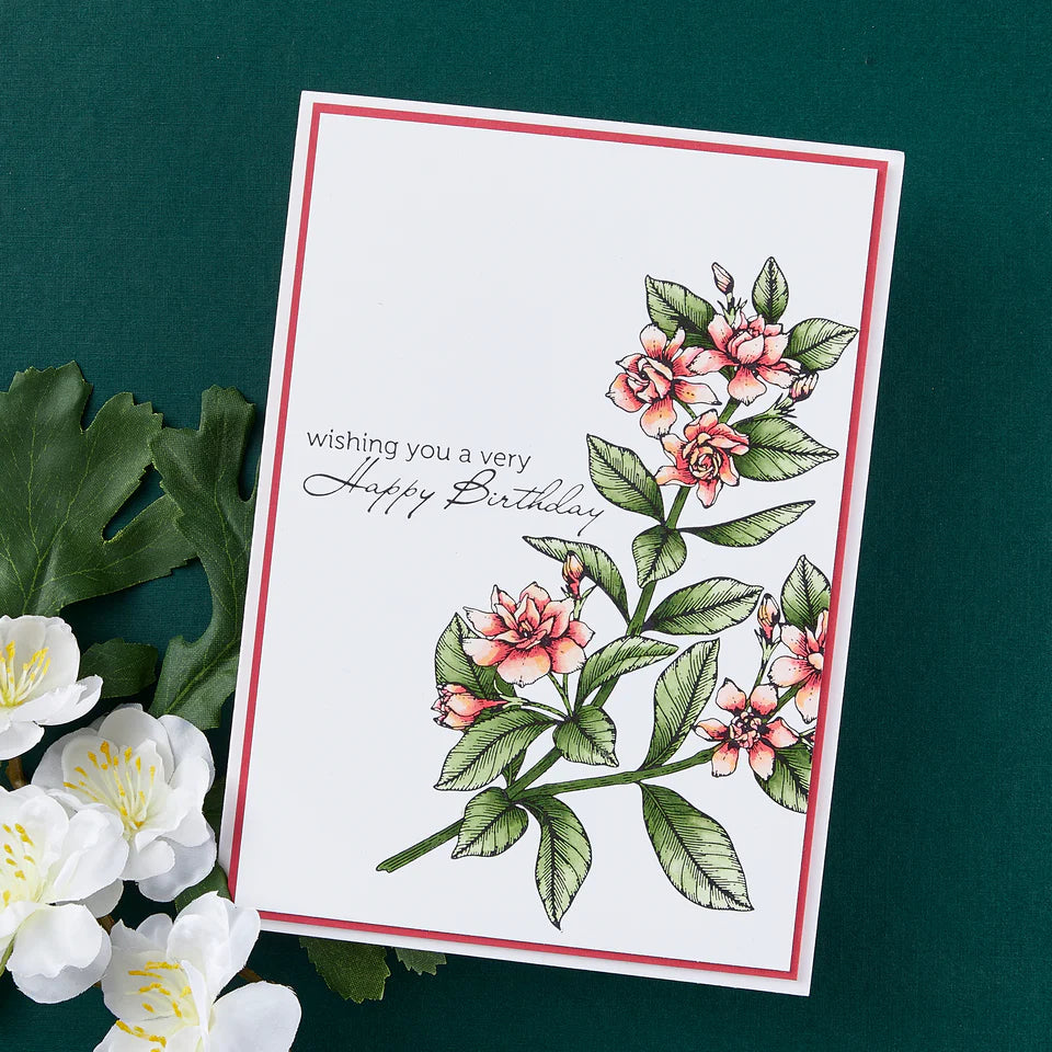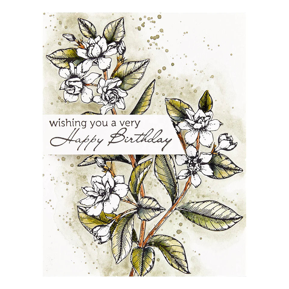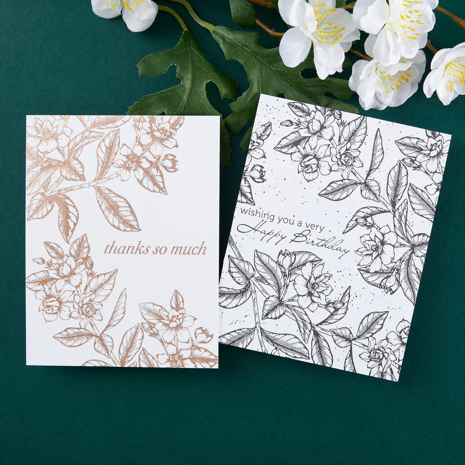 Thanks So Much Floral Press Plate is the January 2024 plate for the independent retailers exclusive BetterPress Society. This beautiful plate fills a card with an elegant sweep of gardenia blooms on a branch and includes two sentiment plates for added versatility, 'Thanks So Much' and 'Happy Birthday'. This gorgeous plate is perfect both as a background print and a focal image.