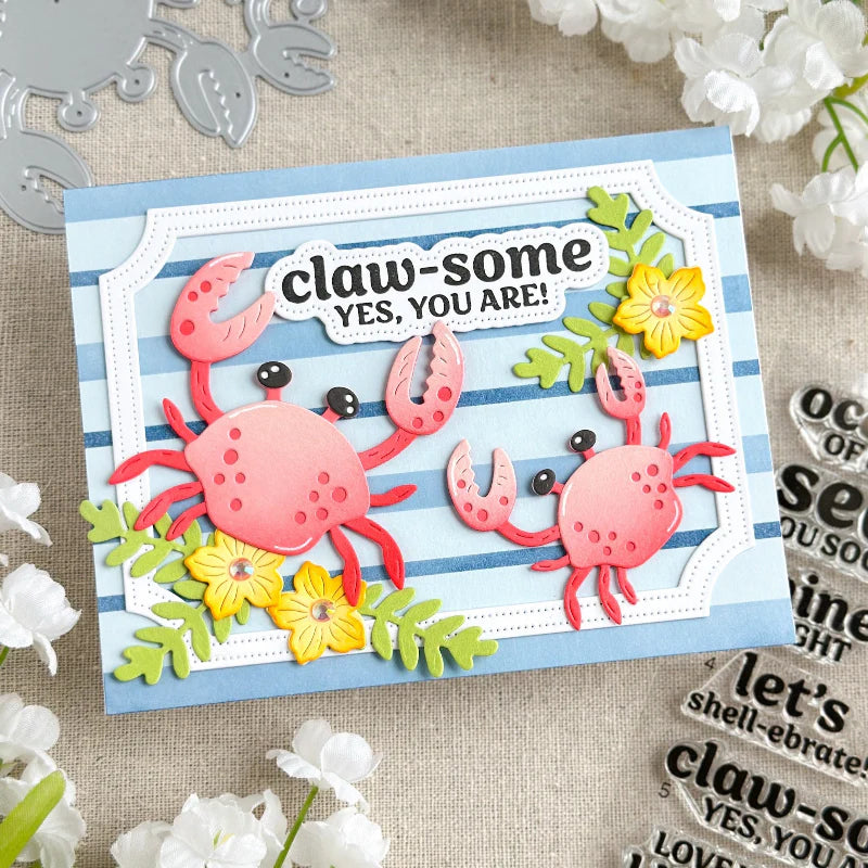 This set features two layered crab designs with a base layer and a detail layer for the bodies and eyes. Fun accessories like a flower, shell, ring, and diamonds are included so your crabs can hold something in their claws—perfect for playful, beachy cards!