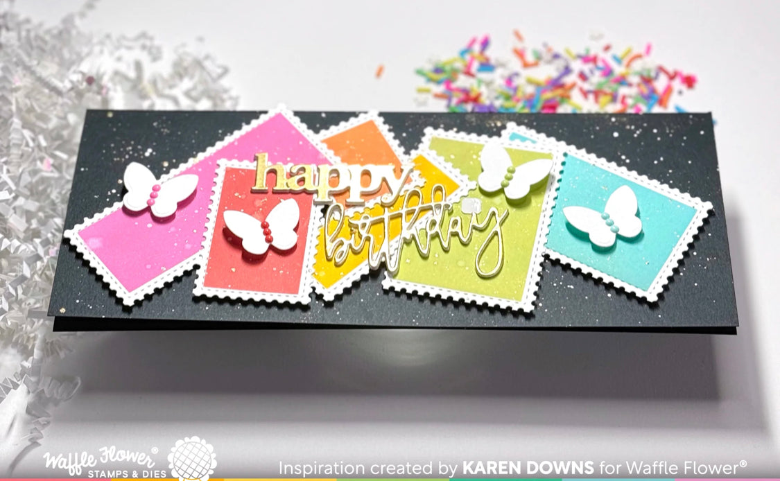 The Slimline version of our popular Postage Collage Die can be used with the Slimline Colouring Stencil or on its own to create the look of postage stamps. The set includes 5 individual varied stamp shapes, along with a panel of stamps that you can easily trim into individual pieces to create your own collage.